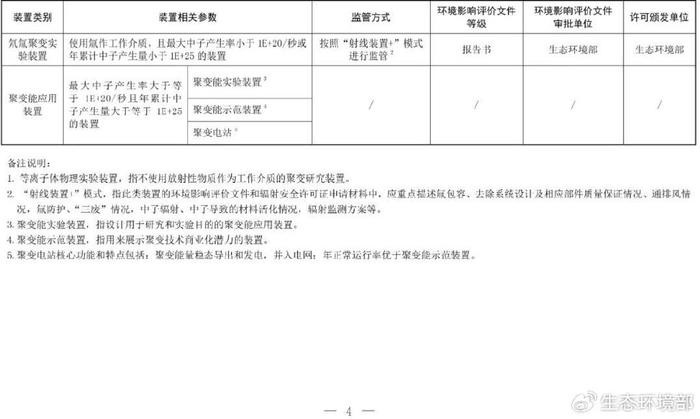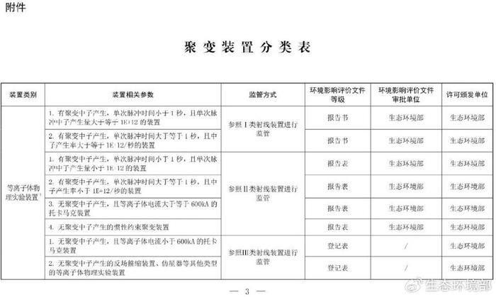 各省、自治区、直辖市生态环境厅(局),新疆生产建设兵团生态环境局: 当前,我国聚变研究进入快速发展期,已建成若干座聚变装置,个别装置计划开展氘氚燃烧、氢硼聚变等实验研究,聚变能应用的工程化设计研究稳步推进。该类装置属于大型科研设备,技术复杂,种类多样,辐射安全风险不同于传统裂变堆和粒子加速器。为进一步规范聚变装置辐射安全监管,现将有关事项通知如下: 一、本通知所指聚变装置,是指开展受控核聚变和等离子体物理研究及进行聚变能开发利用的装置,通常研究通过聚变过程,将原子核转变为不同的元素、同位素或者其他粒子,并直接使用粒子、热量或电磁辐射等产物。该类装置可划分为等离子体物理实验装置、氘氚聚变实验装置和聚变能应用装置。现有和在建装置包括开展等离子体物理实验的托卡马克装置、反场箍缩装置、仿星器等,在建的拟使用氚作为工作介质的紧凑型聚变能实验装置等,以及正在进行工程概念设计的中国聚变工程实验堆等。 二、聚变装置的辐射安全由我部参照核技术利用设施实施监督管理,并颁发辐射安全许可证,日常监督检查由我部地区核与辐射安全监督站负责。 三、基于不同类型聚变装置的辐射安全风险,我部对聚变装置进行分类管理(见附件),与现行辐射管理要求有效衔接,便于建设单位根据相应的类别办理环境影响评价手续。我部将实行环境影响评价与辐射安全许可接续办理,探索开展环境影响评价与辐射安全许可“审评合一”。 四、在本通知印发之日前,已经批准或者备案的环境影响评价文件继续有效,已经持有的辐射安全许可证继续有效,有效期届满时按此通知要求向我部申请换发;尚未申请环境影响评价文件审批或辐射安全许可证的,按照此通知要求向我部提交申请。 五、本通知自印发之日起施行。原环境保护部办公厅印发的《关于磁约束聚变实验装置辐射安全管理有关事项的通知》(环办辐射函〔2016〕1670号)同时废止。
